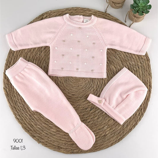 Conjunto de punto bebé 3 piezas con gorro rosa crudo Pelottas 9006 Polaina, jersey y gorrito