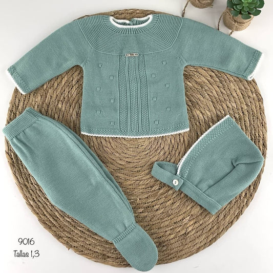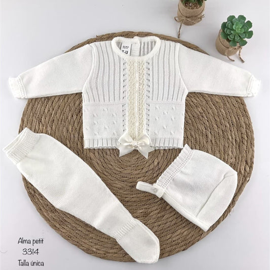 Conjunto de punto bebé 3 piezas con gorro cuelo bebé crudo Pelottas 9005 Polaina, jersey y gorrito