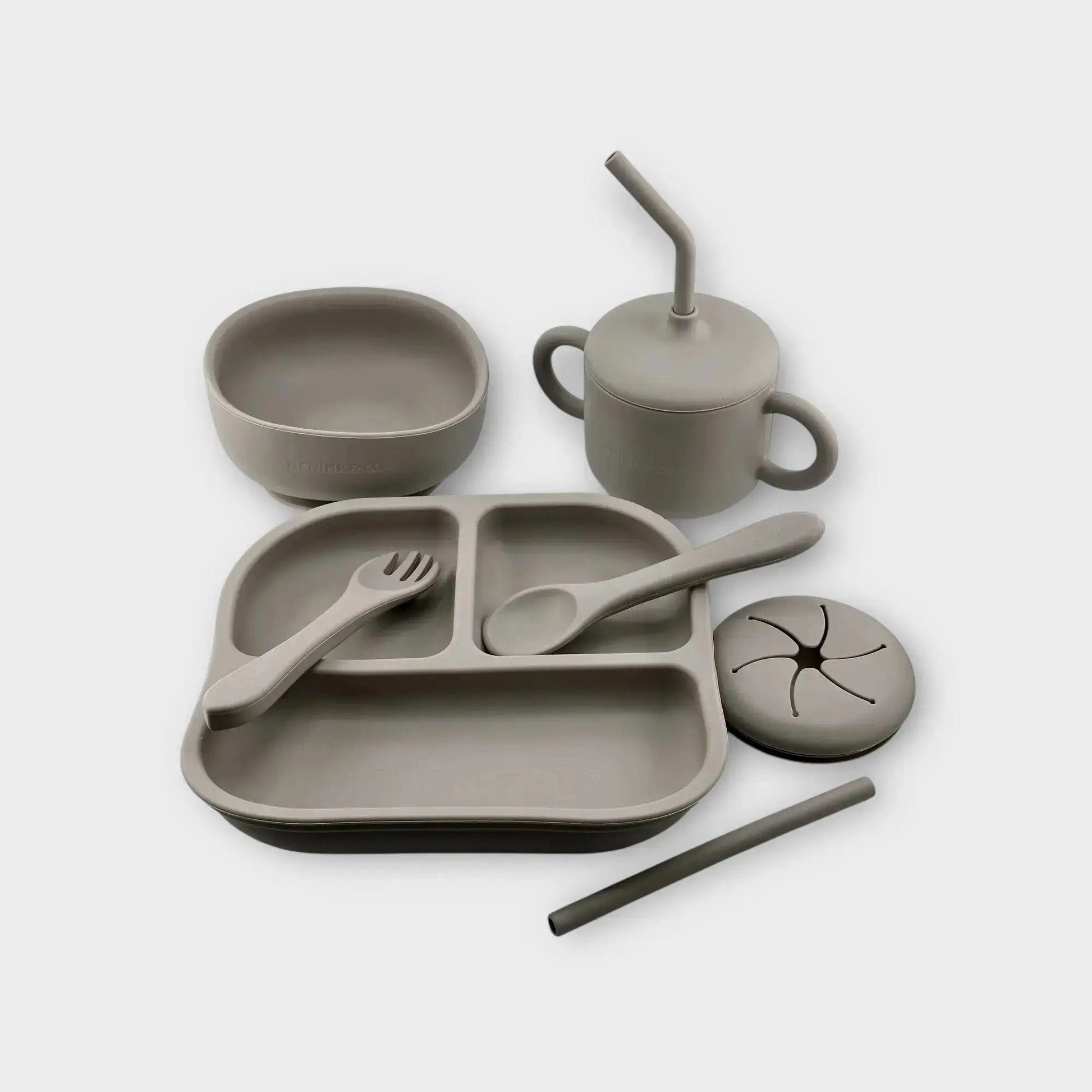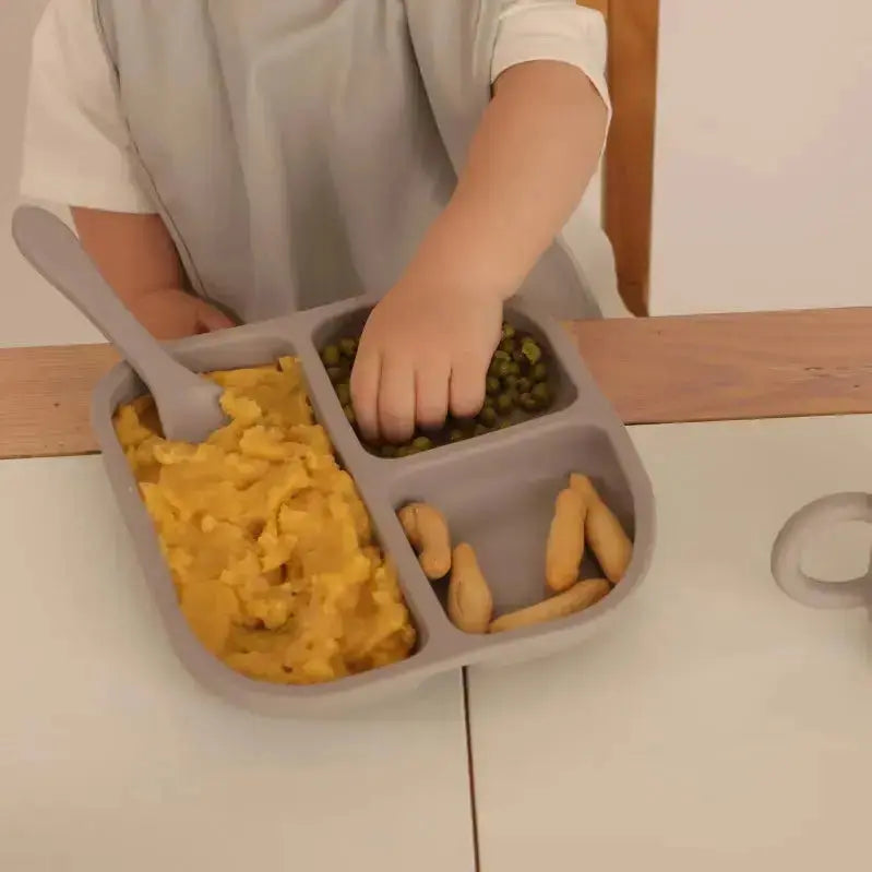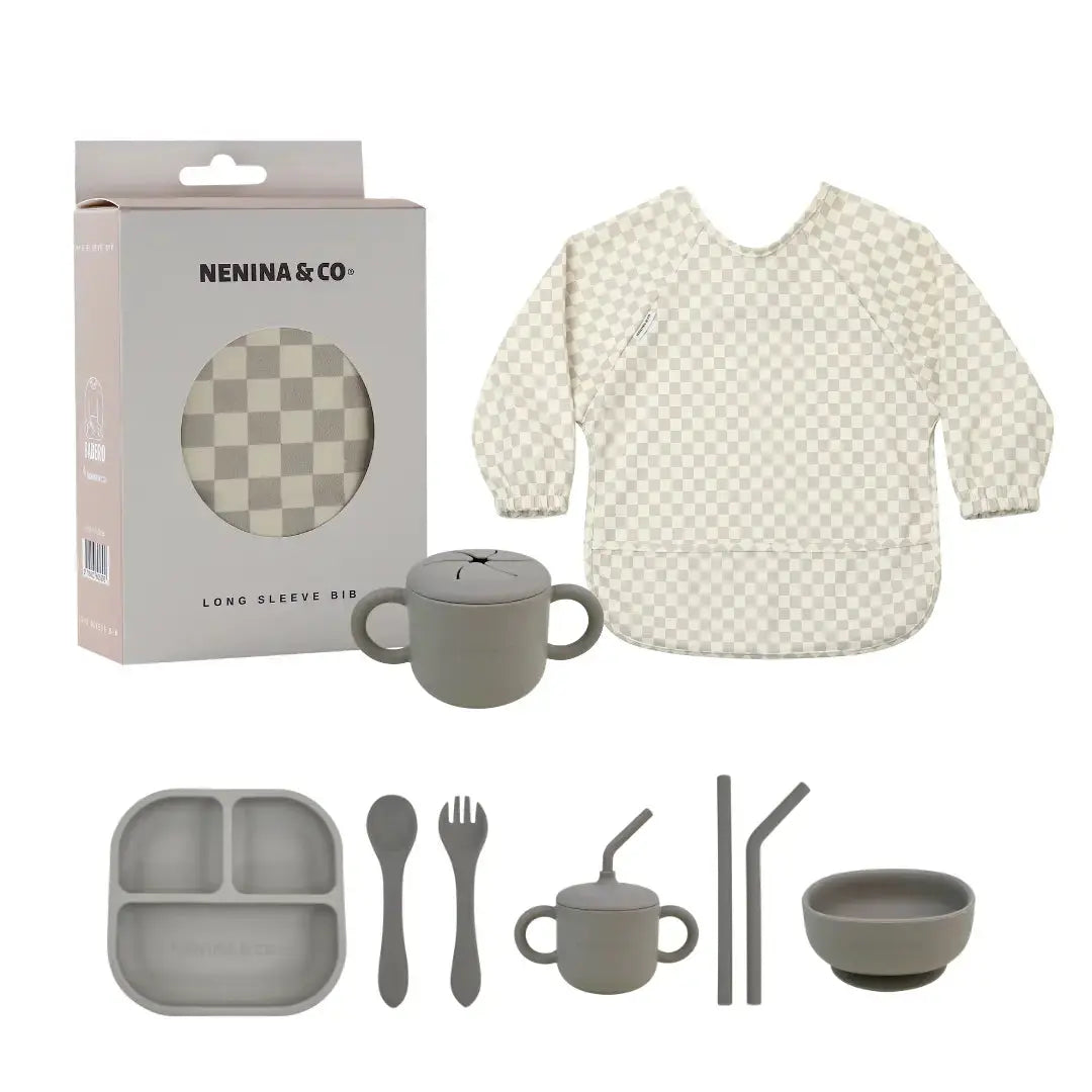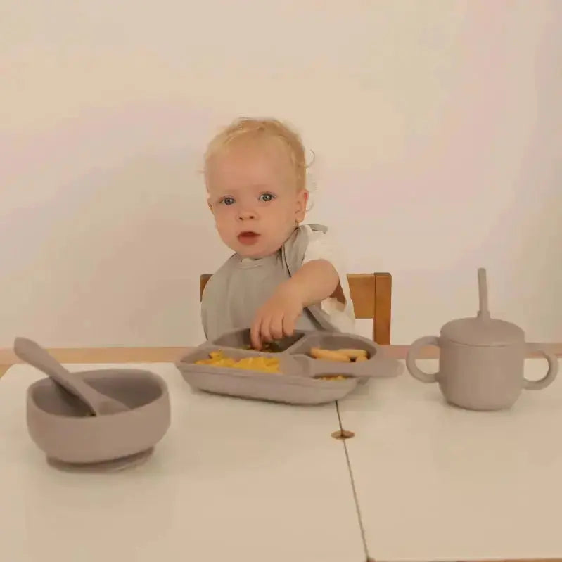 Kit Deluxe Babero + Vajilla BLW Gris 9 Piezas de Silicona orgánica con ventosas Nenina & Co