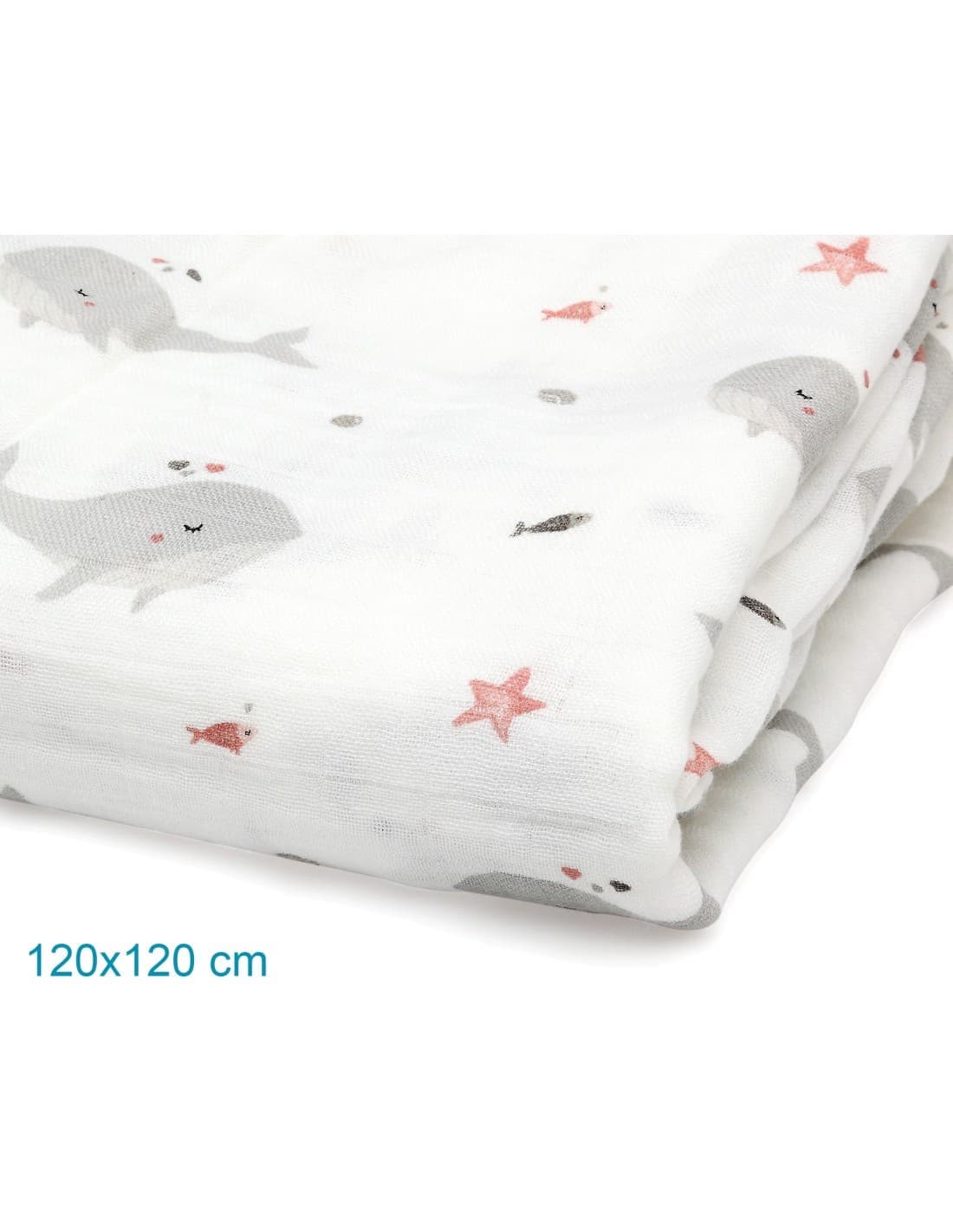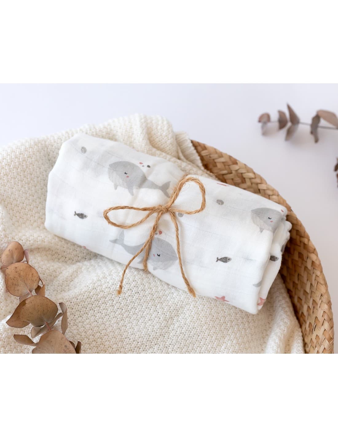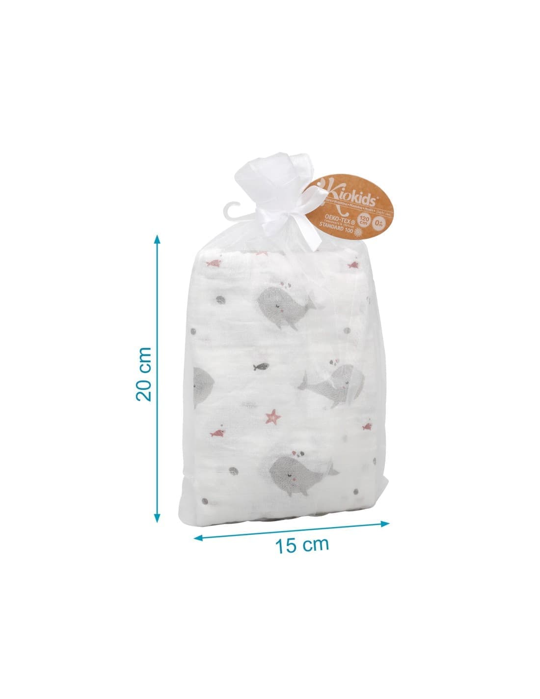 Muselina bebé 120x120 cm estampado ballenas KIOKIDS Tejido bambú y algodón