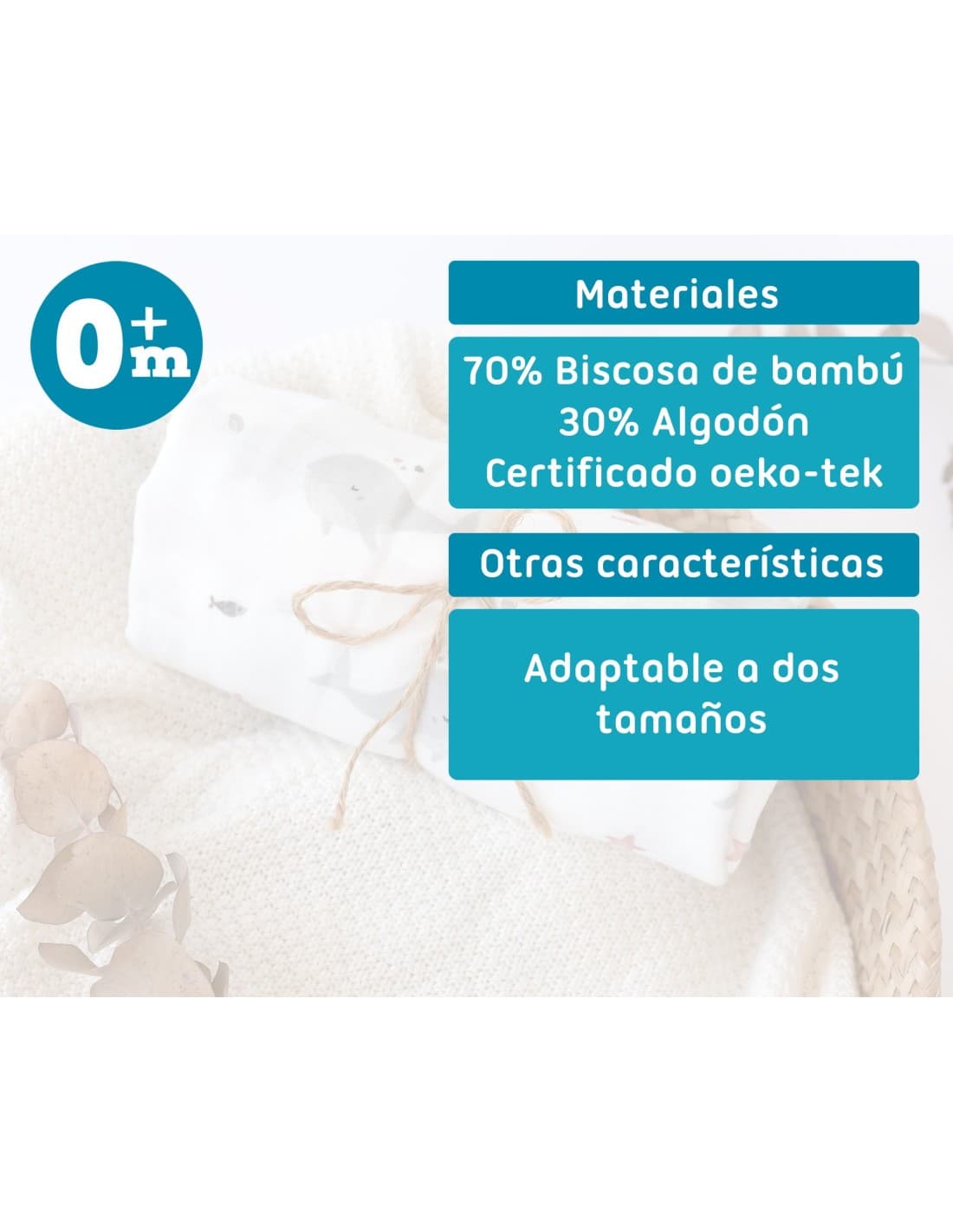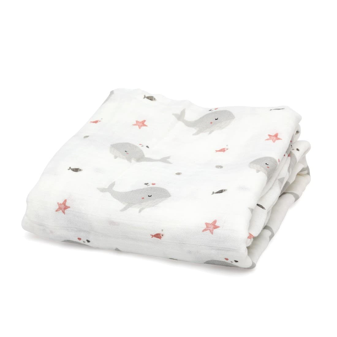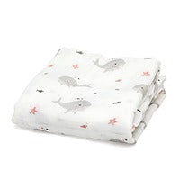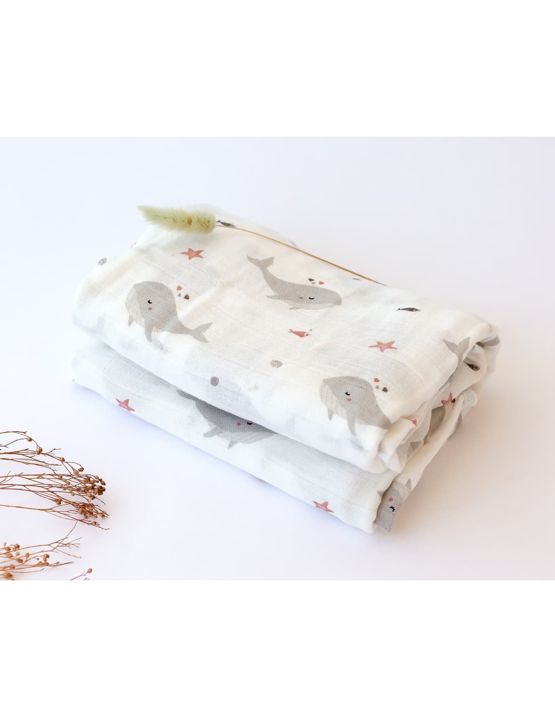Muselina bebé 120x120 cm estampado ballenas KIOKIDS Tejido bambú y algodón